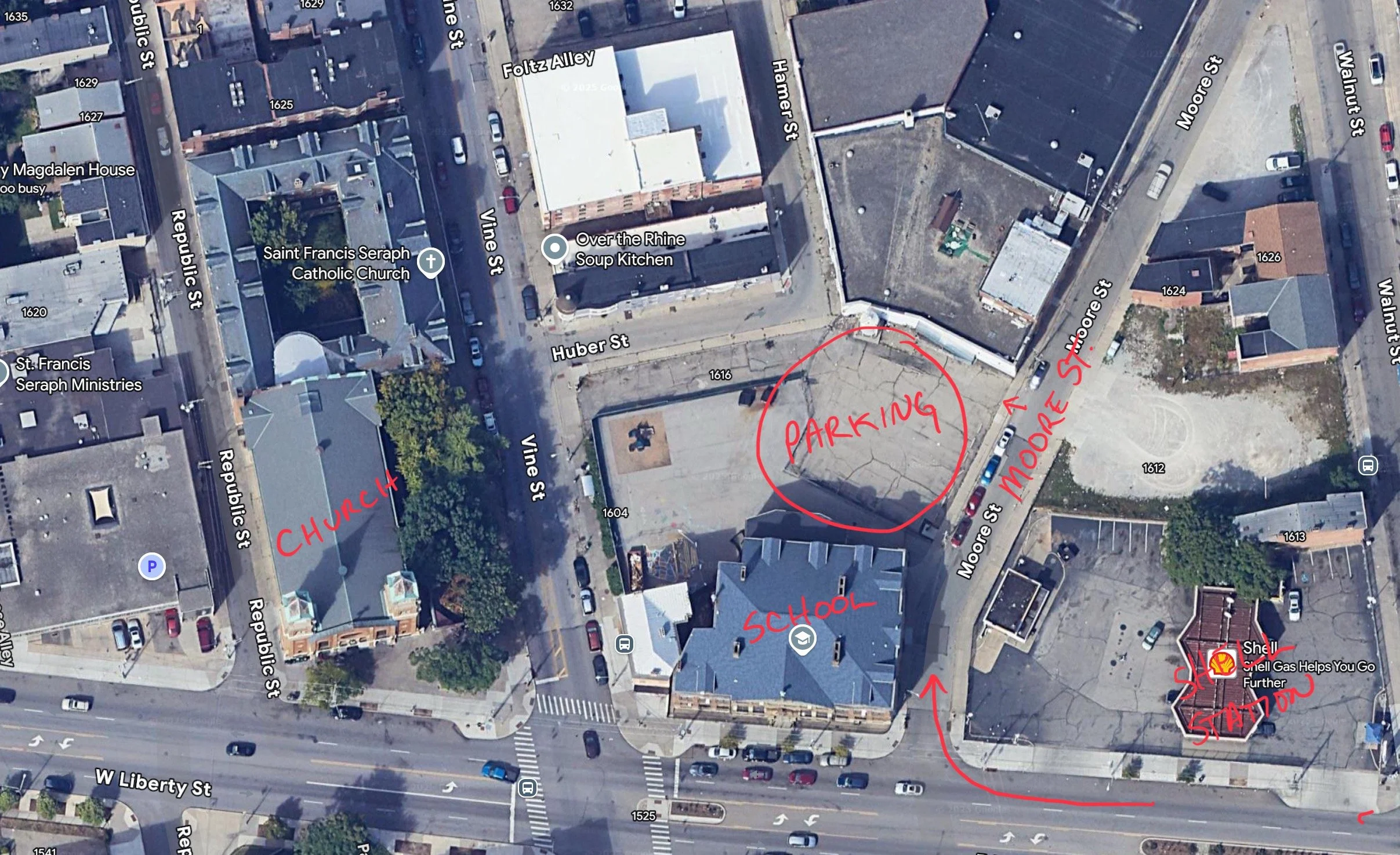 Saint Francis Seraph Church is located at 1615 Vine St, Cincinnati, OH 45202. Br. Tim is graciously opening the school parking lot for our group. It is located off Liberty Street on Moore Street directly behind the school, right after the Shell Station (the school/lot are to the right of the Church if you’re looking straight ahead at it). I have attached a photo of a map I diagrammed in red to better explain. We will depart for the Church after Mass. All are asked to arrive by 11am.
